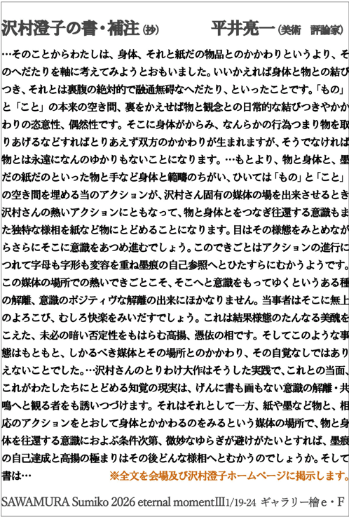 沢村さんのとりわけ大作はそうした実践で、これとの当面、これがわたしたちにとどめる知覚の現実は、げんに書も画もない意識の解離・共鳴へと観る者をも誘いつづけます。それはそれとして一方、紙や墨など物と、相応のアクションをとおして身体とかかわるのをみるという媒体の場所で、物と身体を往還する意識におよぶ条件次第、微妙なゆらぎが避けがたいとすれば、墨痕の自己達成と高揚の極まりはその後どんな様相へとむかうのでしょうか。そして書は…
